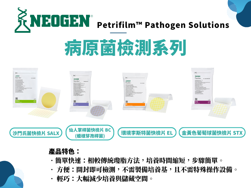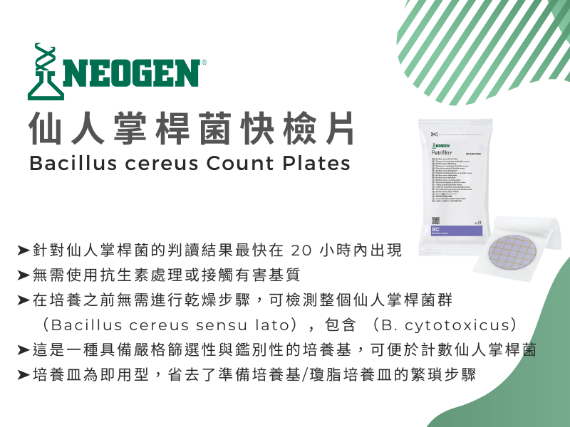 Neogen® Petrifilm® 蜡樣芽孢桿菌計數快速檢驗片(Bacillus cereus Count Plates,BC 片)為食品產業常用之 Bacillus cereus 定量工具。